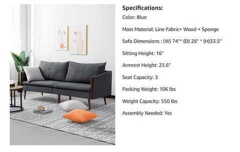 【Perfect for Small Space】: Modern design sofas for living room, it measured 74 inches in width and 28 inches in depth, and allows 3 people to sit on. To upgrade your living room with this comfortable small sofa. This couch is the best choice for any compact living space.