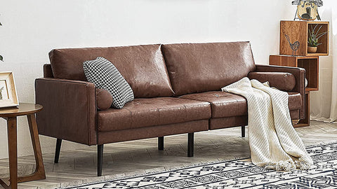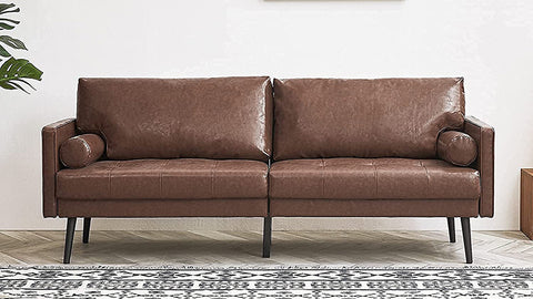 🍁MID-CENTURY MODERN STYLE: Defined by a simple silhouette, mid-century modern charm, this sofa can smoothly slide into your existing decor without a worry. Its clean-lined frame is crafted from eucalyptus and is covered in refreshing, stretchy selected brown PU leather upholstery. This leather couch is a lasting addition to a home, apartment, or small living space.