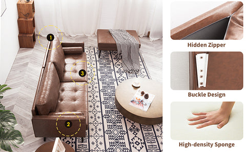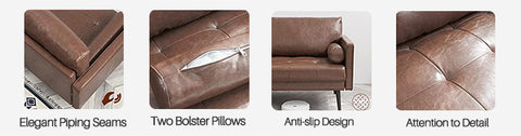 🍁EASY TO ASSEMBLE & CARE: You only need to insert a metal buckle into the sofa at the right angle and install the sofa legs. You will be pleasantly surprised to find that the sofa is only packed in a small box. In just 15 minutes, you can immediately enjoy the high-density foam cushion wrapped in soft leather, get all the comfort of a 73.2" x 27.5" x 26.5"couch, but a better space economy. Includes two removable bolster pillows, which are a fusion of comfort and beauty.
